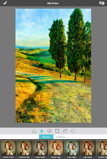 One-touch settings automatically transform photos into paintings using one of many paint styles.